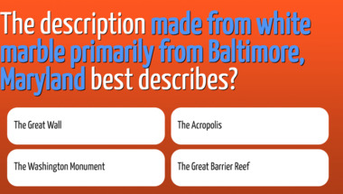 Look forward to questions like "If you are in the city of Cork, where are you?" and "The description "made from white marble primarily from Baltimore, Maryland" best desc.."