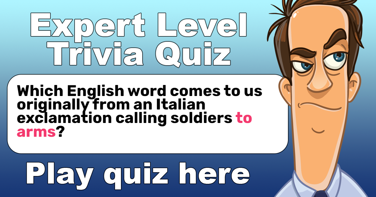 Which English word comes to us originally from an Italian exclamation calling soldiers "to arms"?