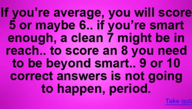 6/10 is the score to beat in this General Trivia quiz to put yourself over the average quiz taker. But you're probably going to be able to answer questions ""Crime and Punishment", "Anna Karenina" and "Dr. Zhivago" all belong to which kind of.." and "Which two South Asian nations are island countries?" easy!