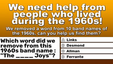 In this fun 1960s bands with a missing word quiz we're going to ask questions like "Which word did we remove from this 1960s band name : "The Four ____"?" and "Which word did we remove from this 1960s band name : "The Rip ____"?".