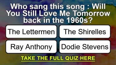 6/10 is what people on average are scoring in this trivia quiz so far. Are you ready to answer questions like "Who sang this song : "Will You Still Love Me Tomorrow" back in the 1960s?" and "Who sang this song : " Roses Are Red (My Love)" back in the 1960s?"