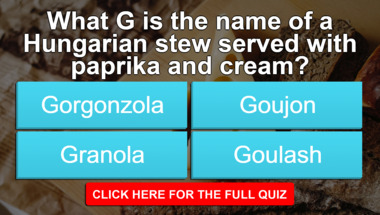 6/10 is the score to beat in this trivia quiz to put yourself over the average quiz taker. But you're probably going to be able to answer questions "What verb means pouring liquid through a sieve to remove impurities?" and "What G is the name of a Hungarian stew served with paprika and cream?" easy!